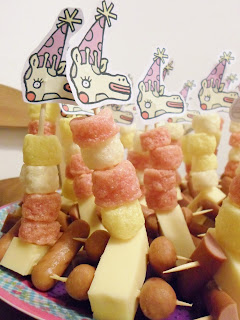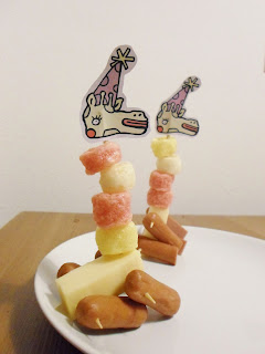 These little giraffes are made from 4 half sausages, 1 block of cheese with two toothpick through it, and a neck from Nibbit Rings around a skewer.